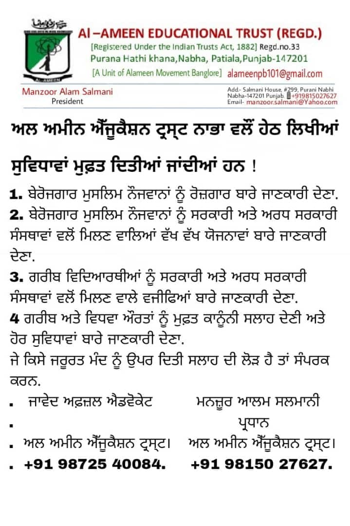 नाभा। अल अमीन एजुकेशनल ट्रस्ट नाभा की ओर से बेरोज़गार मुस्लिम नौजवानों को रोजगार बारे जानकारी देना एवं सरकारी और नीम सरकारी संस्थाओं की ओर से मिलने वाले विभिन्न प्रोजेक्टों के बारे में जानकारी देना, गरीब विद्यार्थियों को सरकारी एवं नीम सरकारी संस्थाओं की ओर से मिलने वाले वजीफों के बारे में जानकारी प्रदान करना, गरीब और विधवा औरतों को मुफ्त कानूनी सलाह देना एवं अन्य सुविधाएं प्रदान करवाना आदि वय्वस्था की जा रही हैं। ये विचार पंजाब टाइमज़ न्यूज़ से बात करते हुए प्रधान मनजूर आलम सलमानी एवं एडवोकेट जावेद अफज़ल ने वय्कत किये। श्री मनज़ूर आलम सलमानी एवं एडवोकेट जावेद अफज़ल ने सांझे रूप से कहा कि इस ट्रस्ट के माध्यम से हमारी चाहत है कि जनता की भलाई एवं उनकी सेवा ज़्यादा से ज़्यादी की जा सके। क्योंकि समाज को आज इन चीज़ों की बहुत ज़रुरत है।