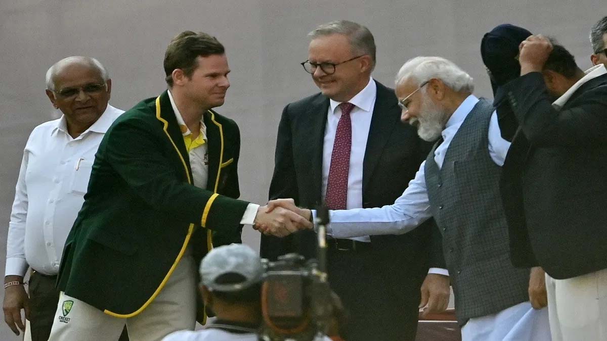 भारतीय प्रधानमंत्री नरेंद्र मोदी ने टीम इंडिया के कप्तान रोहित शर्मा को खास कैप देकर सम्मानित किया। वहीं, ऑस्ट्रेलिया के प्रधानमंत्री एंथनी अल्बानीज ने स्टीव स्मिथ को इस खास टेस्ट मैच की कैप दी। स्मिथ और अल्बानीज आपस में व्यस्त थे, तभी पीएम मोदी ने स्टीव स्मिथ को बुलाया और हाथ मिलाकर उनका स्वागत किया। इसके बाद ऑस्ट्रेलियाई प्रधानमंत्री ने भी रोहित शर्मा से हाथ मिलाया और चारों ने हाथ ऊपर कर भारत-ऑस्ट्रेलिया के बीच दोस्ताना संबंधों की मिसाल दी। प्रधानमंत्री मोदी ने इस तरह सभी का दिल जीत लिया। इस मैच में खेल शुरू होने से पहले एक खास गाड़ी में दोनों नेताओं ने स्टेडियम का एक चक्कर भी लगाया। इस दौरान स्टेडियम दर्शकों से खचाखच भरा रहा और दर्शकों ने दोनों नेताओं का स्वागत किया। इस मैच में टॉस के लिए एक खास सिक्का बनाया गया था, जिसमें दोनों देशों के क्रिकेट से जुड़ी यादों के 75 वर्षों को दिखाया गया था।