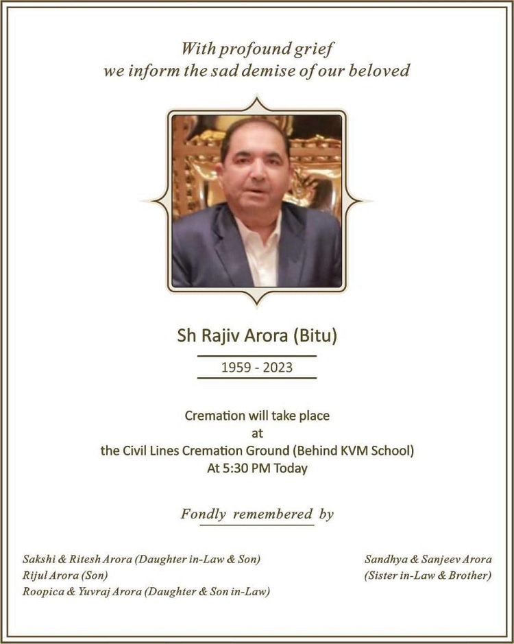 सांसद संजीव अरोड़ा ने बताया कि भाई का अंतिम संस्कार आज शाम 5 बजे सिविल लाइन श्मशान घाट पर किया जाएगा।