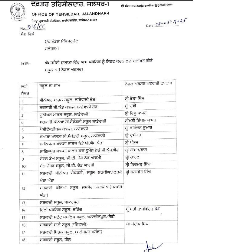 पंजाब डैस्क/  जालंधर,9 मई। भारत-पाक के बीच बने युद्ध के हालातों के मद्देनजर जालंधर प्रशासन की तरफ से एक लिस्ट जारी की गई है, जिसमें आपातकालीन स्थिति बनने पर शहर की पब्लिक को जिन जगहों पर शिफ्ट किया जाएगा, के बारे बताया गया है। जिला प्रशासन की तरफ से इलाकों की लिस्ट बनाई गई है, जहां पर जनता को शिफ्ट किया जा सकेगा। इस लिस्ट में ज्यादातर सरकारी और प्राइवेट स्कूल व कॉलेज शामिल है।