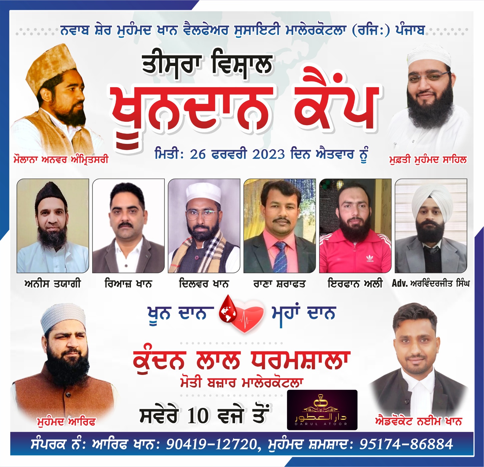 मालेरकोटला, 17 फरवरी (प्रेस विज्ञप्ति) हर साल की तरह इस साल भी नवाब शेर मुहम्मद खान वेलफेयर सोसायटी (रजि.) की ओर से आयोजित तीसरे महारक्तदान शिविर का आयोजन 26 फरवरी को मोती बाजार, कुंदन लाल की धर्मशाला में किया जा रहा है। संस्था प्रधान मुहम्मद आरिफ ने प्रेस को जानकारी देते हुए यह विचार वयक्त किये।
