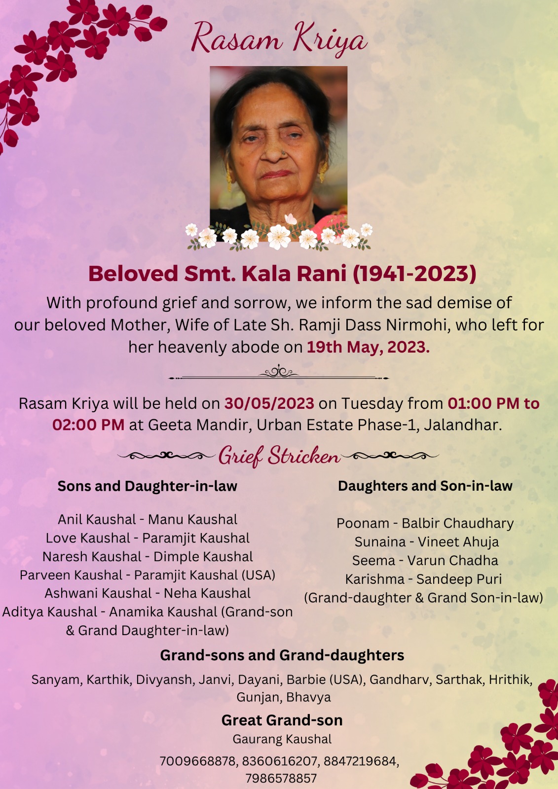 जालंधर। भारत के प्रमुख हिंदी अखबार के वरिष्ठ उप सम्पादक श्री प्रवीण निर्मोही की माता कला रानी (1941-2023) का कुछ दिनों पहले देहांत हो गया था। पंजाब टाईमज़ न्यूज़ को जानकारी देते हुए श्री प्रवीण निर्मोही ने कहा कि उन की रस्म क्रिया का समागम 30/5/2023 दिन मंगलवार 1 बजे से 2 बजे तक गीता मंदिर अर्बन स्टेट फेज-1 में आयोजित किया जायेगा। जिस में प्रमुख शख्सियतों समेत योग गुरू एवं जर्नलिस्ट श्री गु्रप्रीत थापा जी, वरिष्ठ उप सम्पादक श्री क्रष्ण भनोट जी, नैशनल ह्यूमन राईटस सोशल जस्टिस फ्रंट के राष्ट्रीय अध्यक्ष मोैलाना अनवर अमृतसरी, नैशनल ह्यूमन राईटस सोशल जस्टिस फ्रंट की महिला विंग की चेयरपर्सन श्रीमति रिज़वाना जालंधरी, खांबरा मस्जिद के प्रधान मज़हर आलम मजाहिरी भी शामिल होंगे।