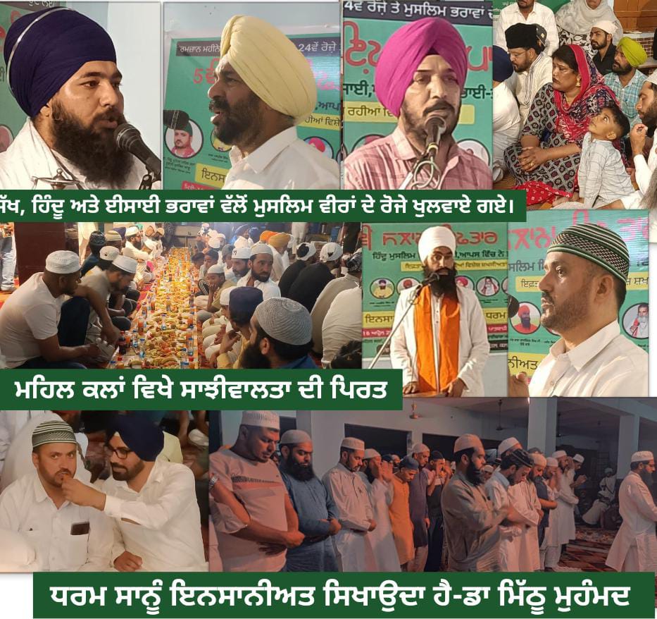 महल कलाँ। हर साल की तरह इलाका महल कलाँ की धरती से सरब सांझी वालता का संदेश देने के लिए समूह धर्मों की ओर से मिल कर इस बार भी गुरद्वारा छेवीं पातछाही में पांचवे रोजा इफतार पार्टी का आयोजन किया गया। नेता डाक्टर मिठ्ठू की रहनुमाई में जमा हुए इस समागम में मशहूर समाज सेवी महंत किरन सिद्धु, बाबा जंग सिंह जी दीवाना, इंस्पैक्ट्र प्यारा सिंह मुहम्मद पुर, बाबा मनप्रीत सिंह अलीपुर खालसा,इंस्पेक्टर प्यारा सिंह मोहम्मदपुर, बाबा मनप्रीत सिंह जी अलीपुर खालसा, बाबा राजविंदर सिंह जी टिब्बा, मुहम्मद इलियास मलेरकोटला, बहादुर खान ढबलान पटियाला, बाबा शेर सिंह जी अध्यक्ष गुरुद्वारा प्रबंधक कमेटी महलकलां, मुहम्मद अकबर अध्यक्ष मस्जिद कमेटी महलकलां, दुकानदार यूनियन अध्यक्ष गगन सरन , समाजसेवी सरबजीत सिंह संधू, हरि सिंह कटिहरिया, सरपंच राजविंदर कौर, सरपंच बालोर सिंह तोती, गुंटाज प्रेस क्लब के अध्यक्ष डॉ परमिंदर सिंह, आजाद प्रेस क्लब के अध्यक्ष जसबीर सिंह, प्रेस क्लब गुरप्रीत सिंह अंखी, हरजीत सिंह खयाली, कुलवंत सिंह टिब्बा, निर्मल सिंह पंडोरी, बलिहार सिंह गोबिंदगढ़, अमनदीप पासी, रागबीर कुमार राघा आदि ने अपने अपने विचार रखे ।